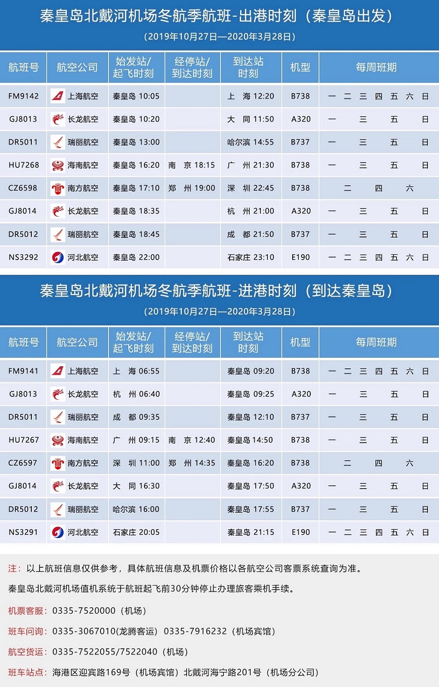 北戴河机场冬航季航班(2019.10.27-2020.3.28)